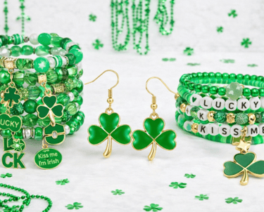 If you prefer subtle holiday style, shamrock earrings and necklaces are a perfect option. Glitter shamrock drop earrings and layered bead necklaces are popular this season because they add sparkle without feeling over the top.