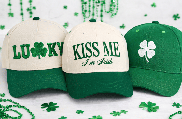 A festive hat is one of the easiest ways to pull together a holiday outfit. Shamrock-themed baseball caps are trending this year, especially designs featuring bold embroidered lettering and classic green details.