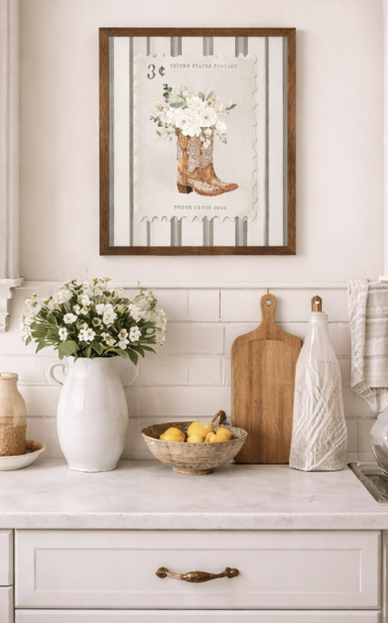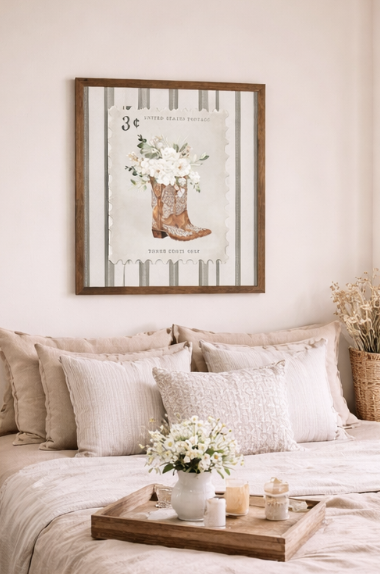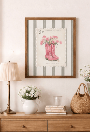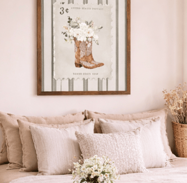 If you love decorating with pieces that tell a story and add personality to your home, vintage western-inspired décor is having a major moment. One standout trend combining nostalgia, feminine style, and country charm is vintage postage-stamp-style wall art featuring cowboy boots and florals. This unique design brings together timeless western elements with soft, romantic touches that instantly warm up any space.
